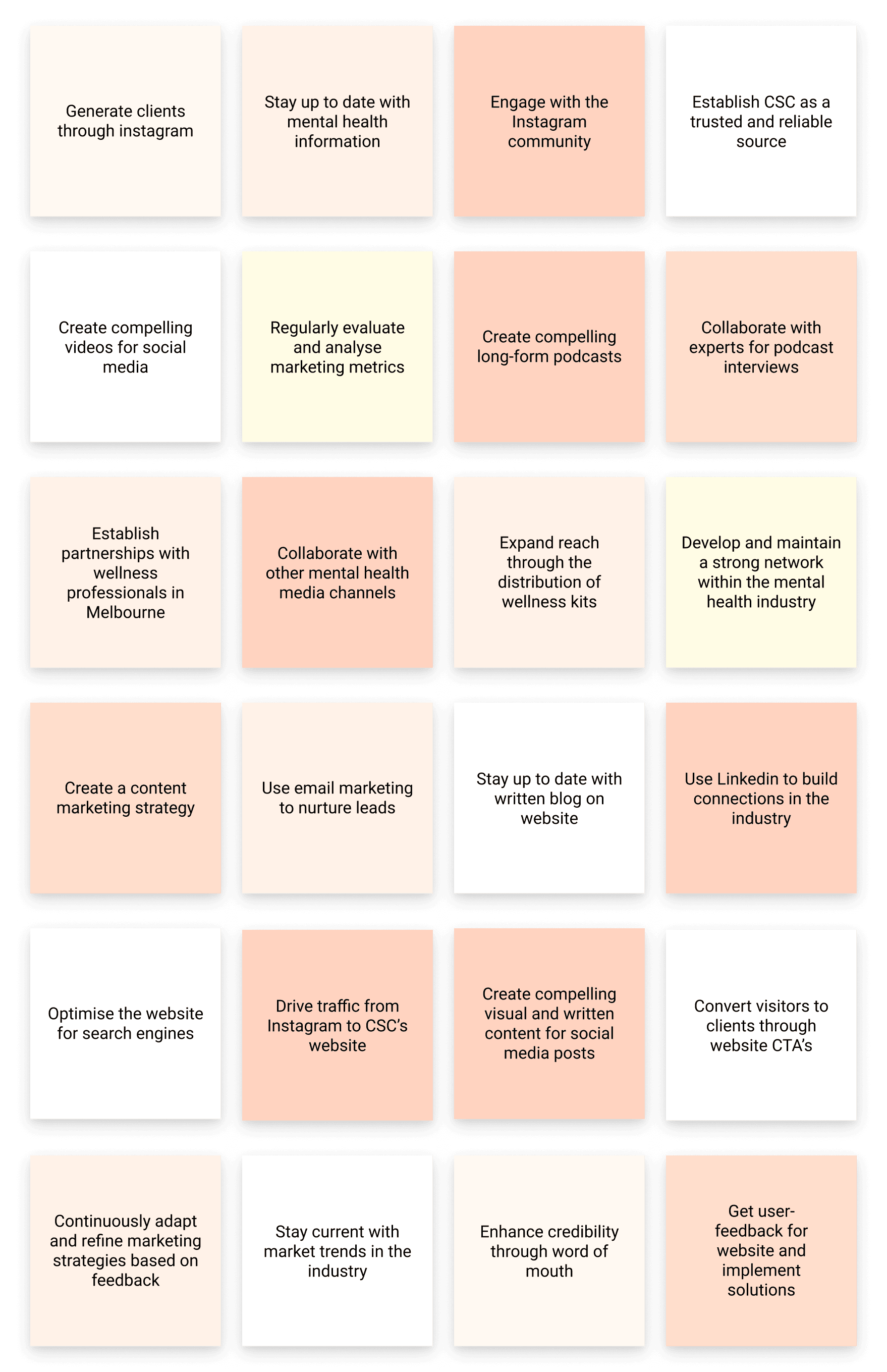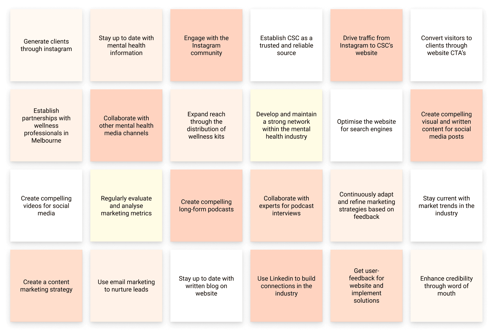 Brainstorming the overall brand: To compete with larger organisations, we decided that Centre Self Collective would focus on establishing a personalised online presence with a user-friendly and approachable website built around trust. This would also work well when competing with smaller organisations, as there also didn’t seem to be any in the space successful in this approach.