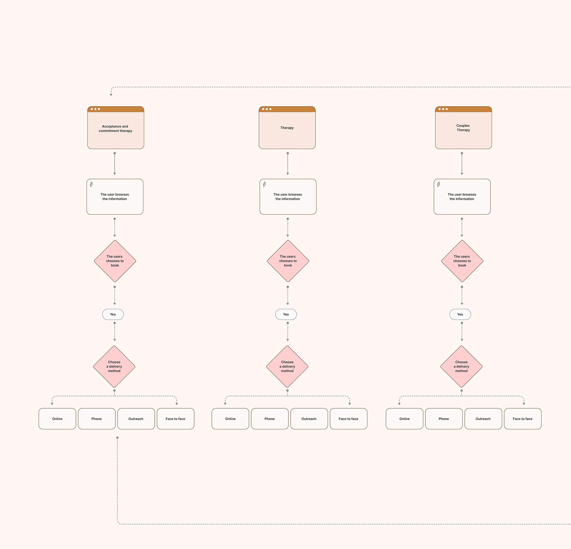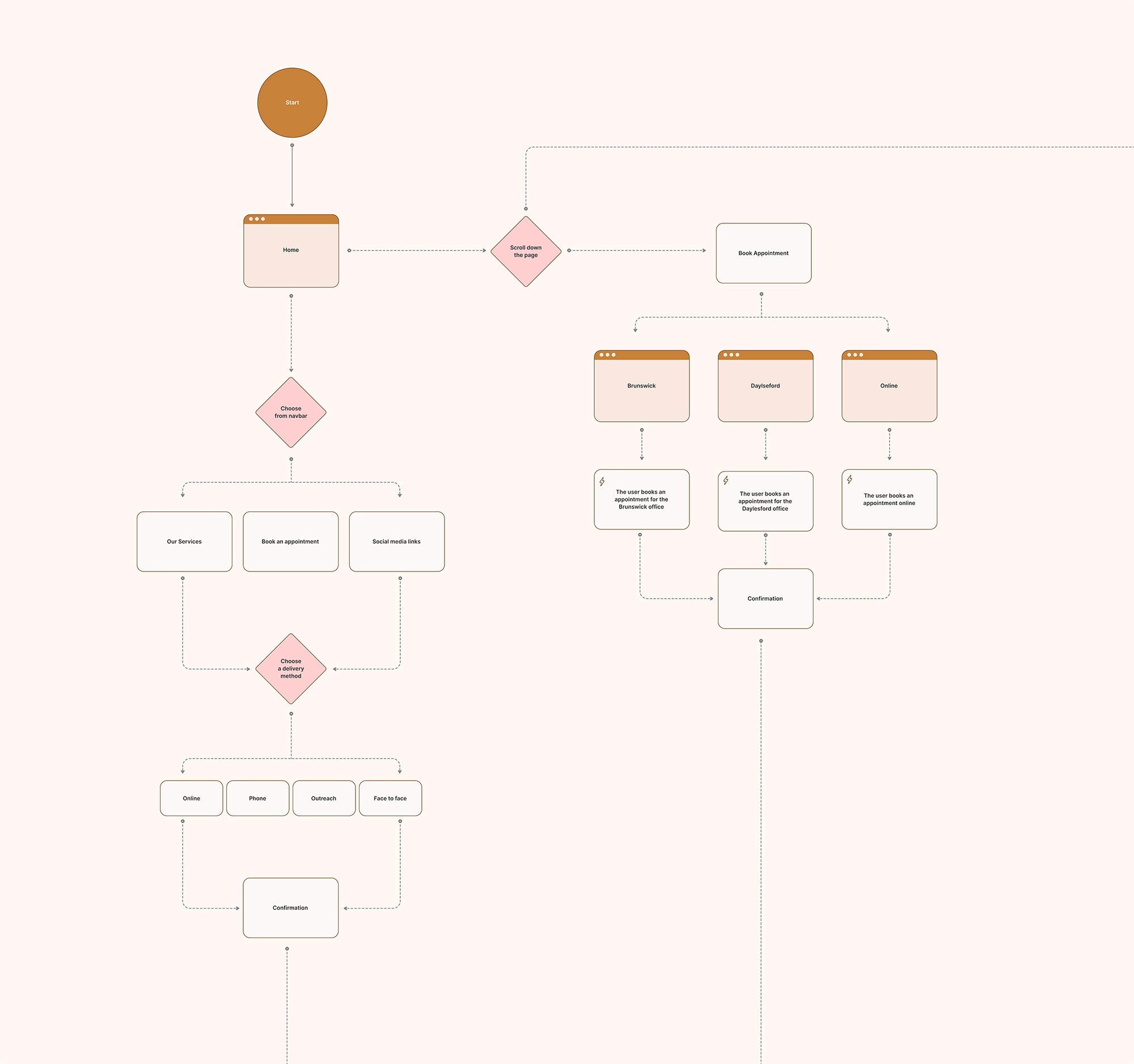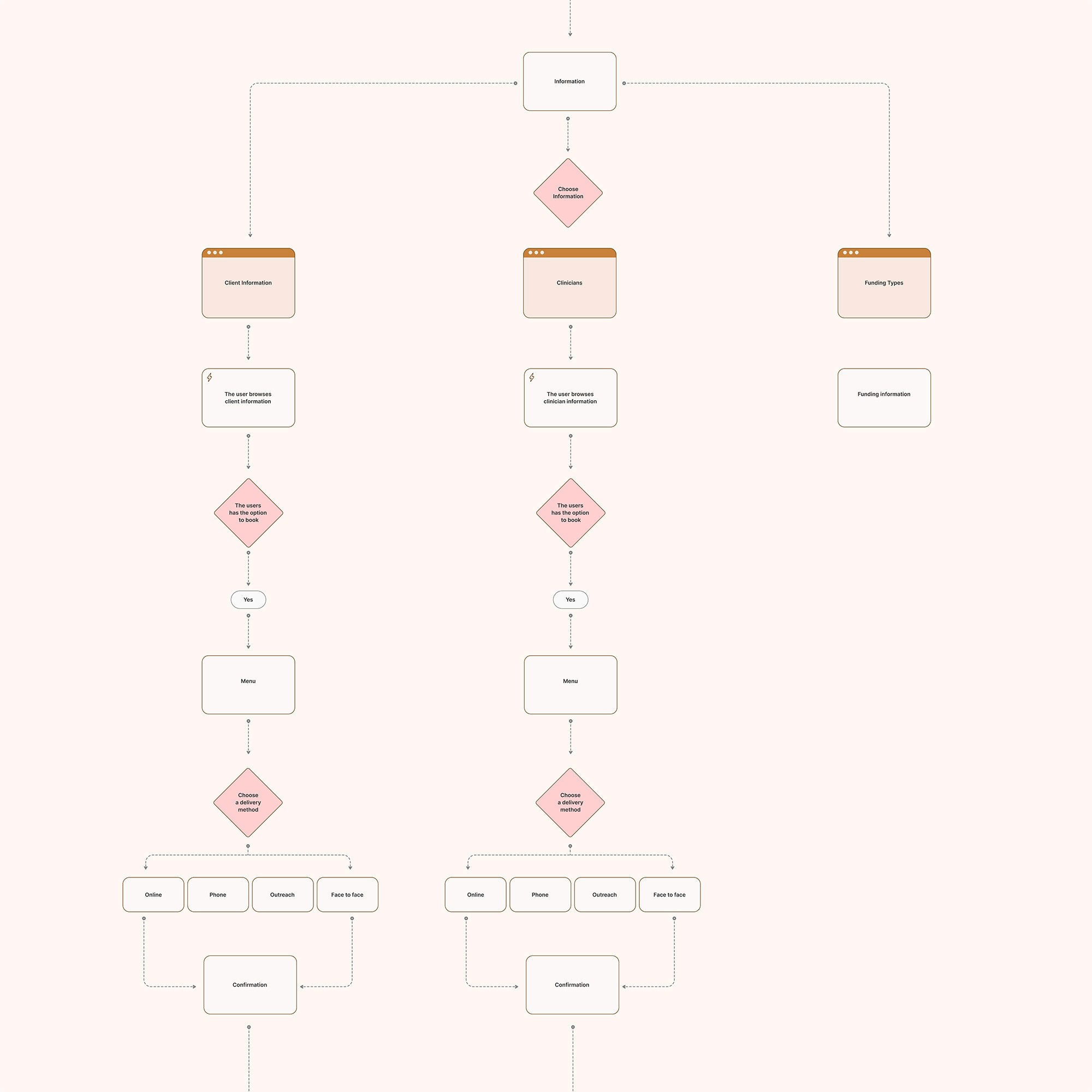 Next I had a virtual meeting with Tamera and Amy with the intention of better understanding the specifics of their business. To do this I used a whiteboard in Figjam and asked the team key questions. What services do Centre Self Collective offer? What do they want to emphasise? What other resources will the website contain? With this information, I worked on the user journey, the blueprint of the website, which addressed the users entire experience from beginning to end.