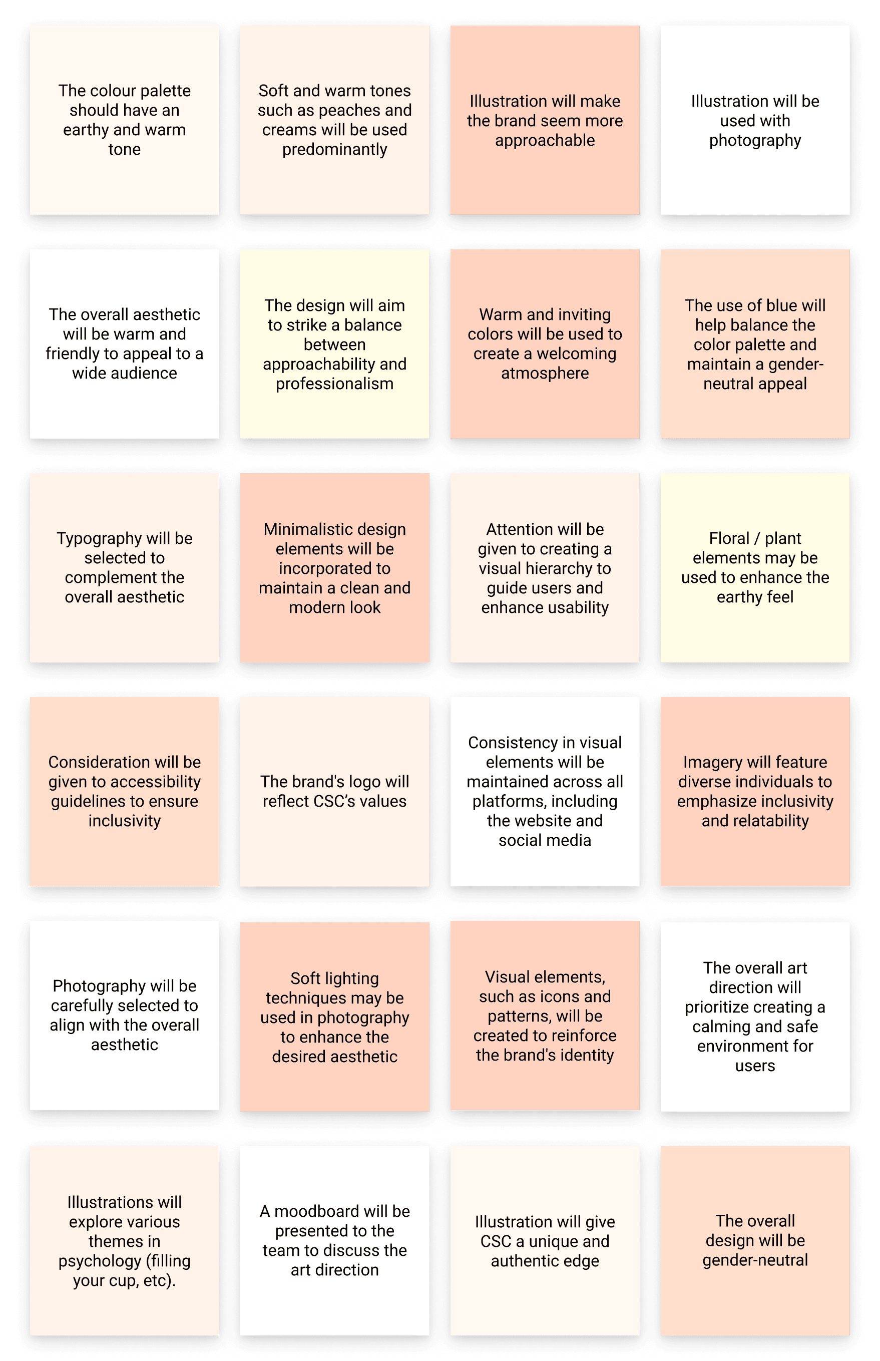 Discussing the art direction: During one of our many brainstorming sessions, we delved into the art direction and visual strategy. Our focus was on creating an down-to-earth and approachable brand, incorporating soft and warm tones like peaches and creams. To make the brand more approachable, we decided to use illustrations, which would be combined with photography to strike a balance between professionalism and relatability. Inspired by the successful use of illustrations by Headspace and Beyond Blue, we aimed to create a soft and friendly visual atmosphere with wide appeal.
