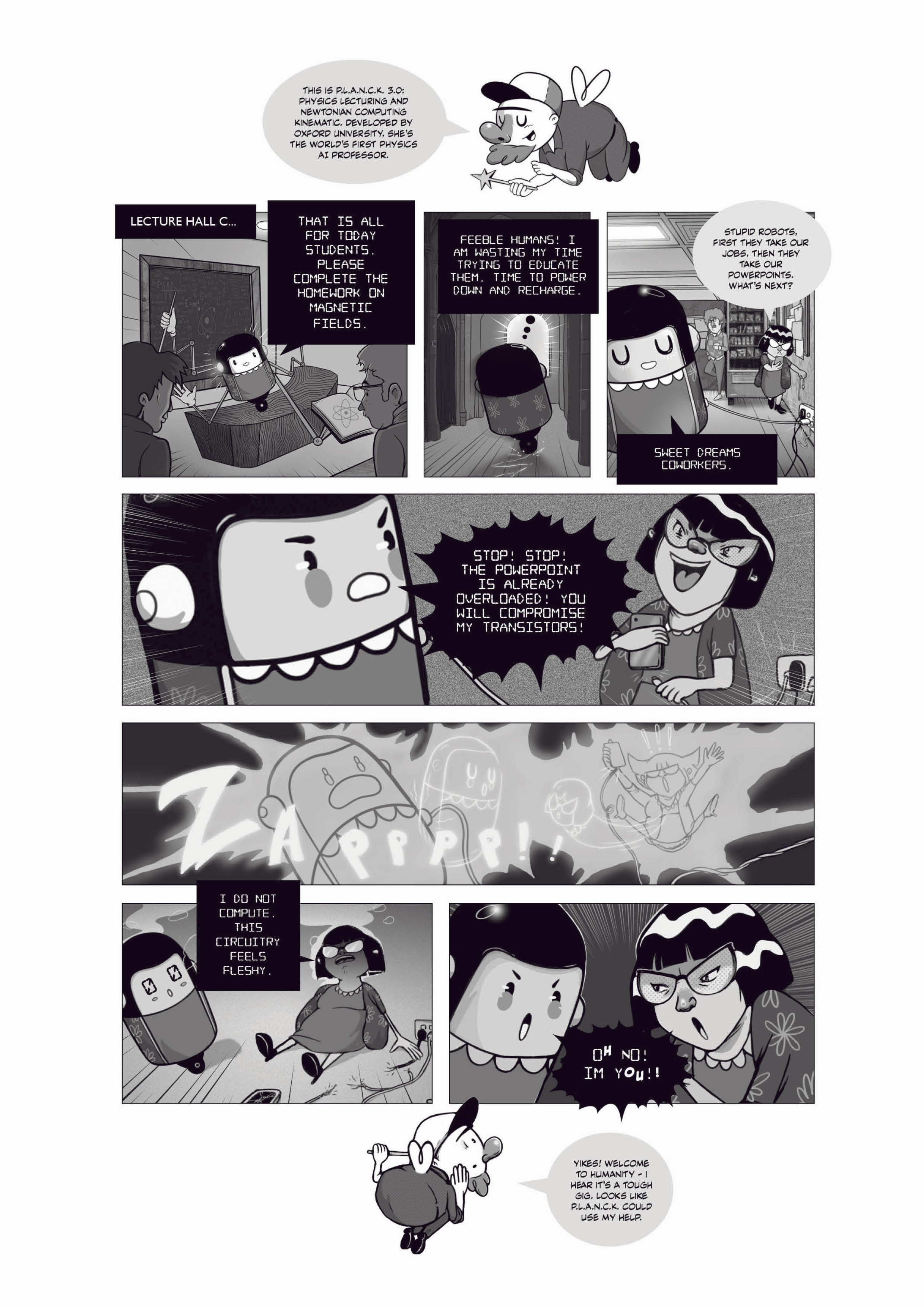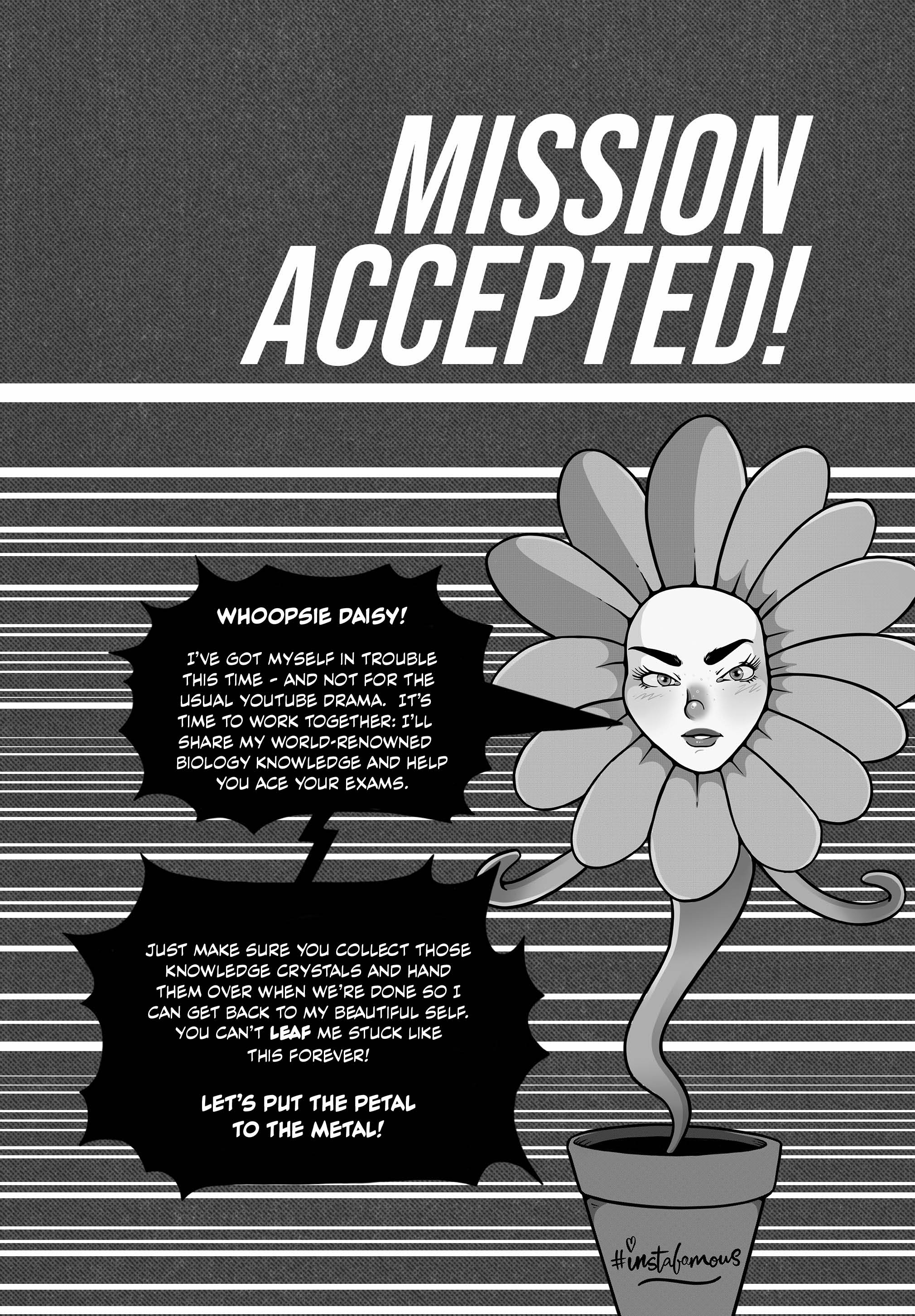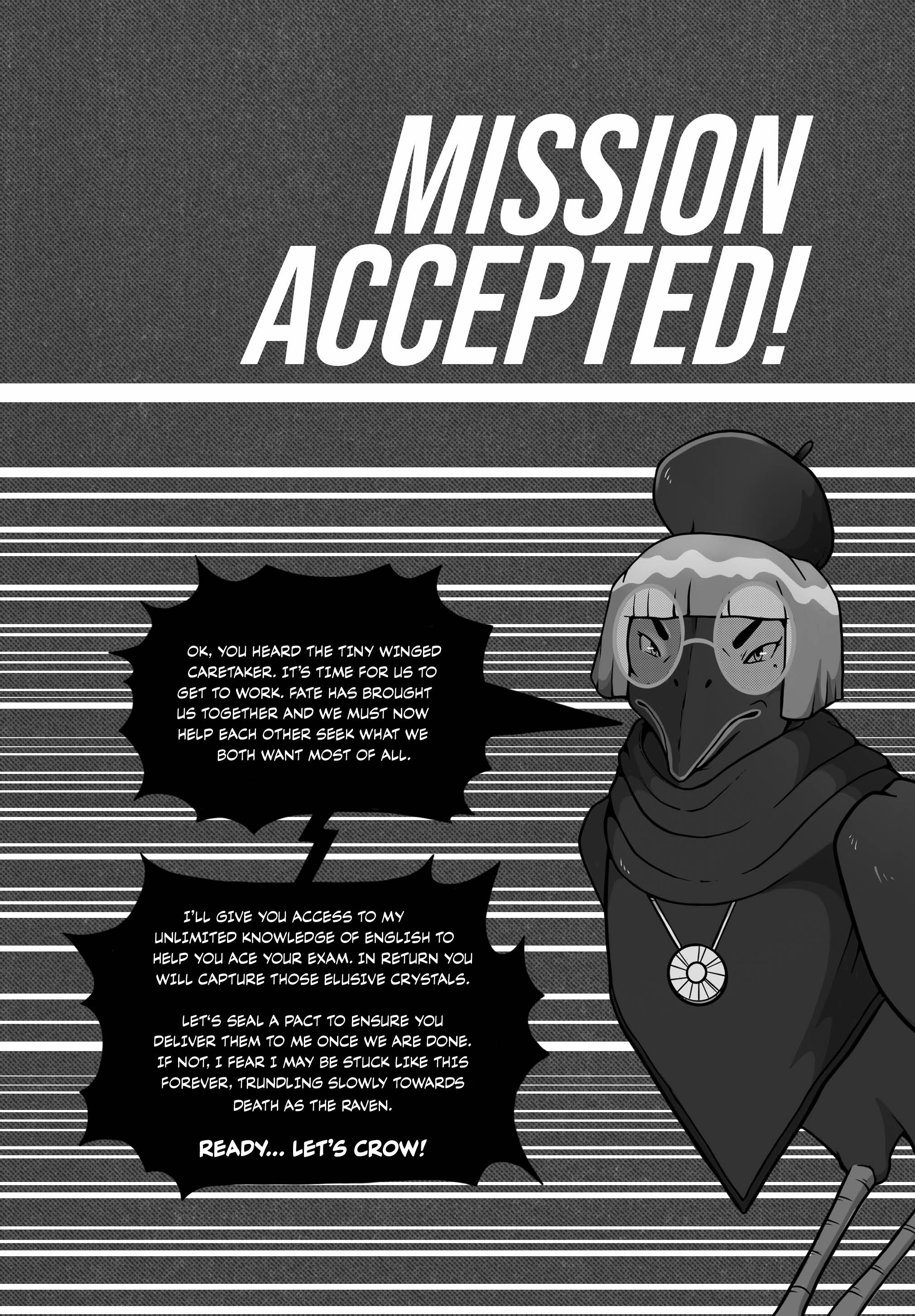 The graphic narrative we developed would feature an Oxford University professor undergoing an accidental transformation and needing the readers help to transform back. After completing chapters, readers are awarded crystals which are used to assist in this transformation. This narrative would be illustrated in the form of comic-pages, book-ending each volume. This comic formula would serve as the interactive component of the series.