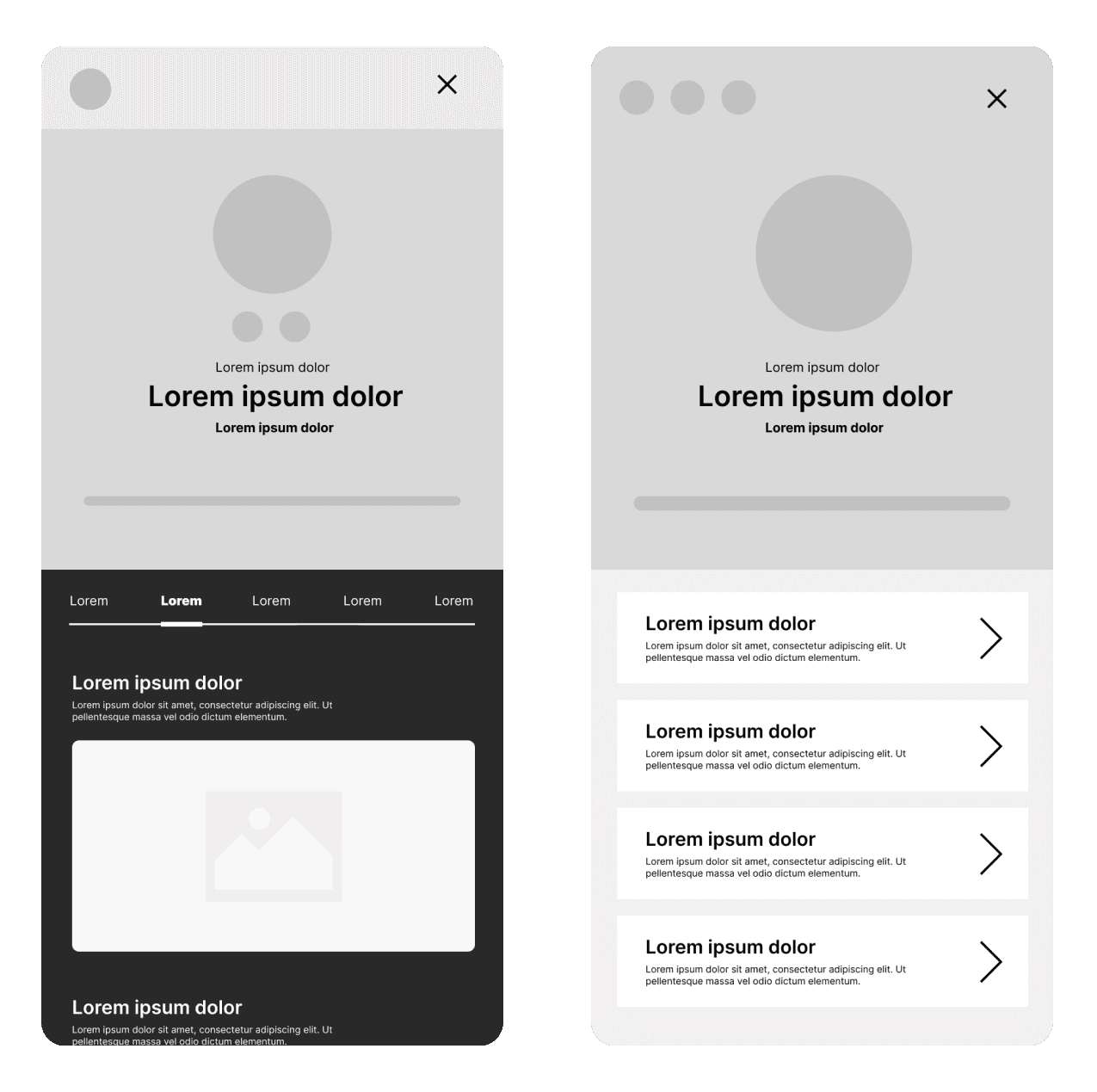 This constraint wasn’t problematic but it did mean information needed to be compartmentalised for deeper level storage. For this I explored three options of storage, which included navigation tabs, accordions and right and left arrows for users to move back and forth.